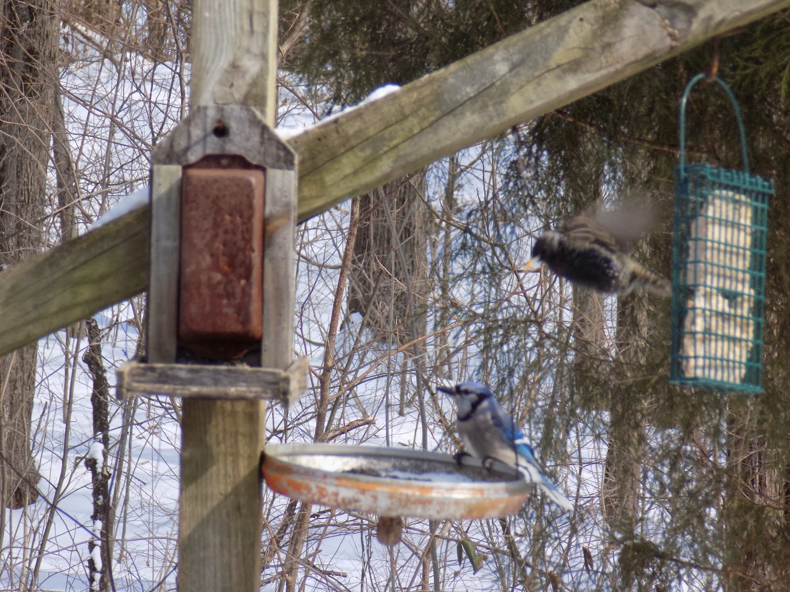 This is a picture of the most popular feeder from a birds point of view. I simple drilled a hole in the side of the lid and many holes around around where the feed goes, again to let out moisture. Birds don't like soggy food. It can get wet, but they don't like it in standing water. There is a piece of wire going up to the cross arm above the Blue Jay. It helps to give the pan support. It is simply a piece of coat hanger. Not exactly high tech. The rusted feeder on the pole is simply and old baking pan that I made a track for the lips of the pan to go down into. If you zoom in you will see I keep the pay from going all the way down by simply putting a couple nails in the way of the pan lips.